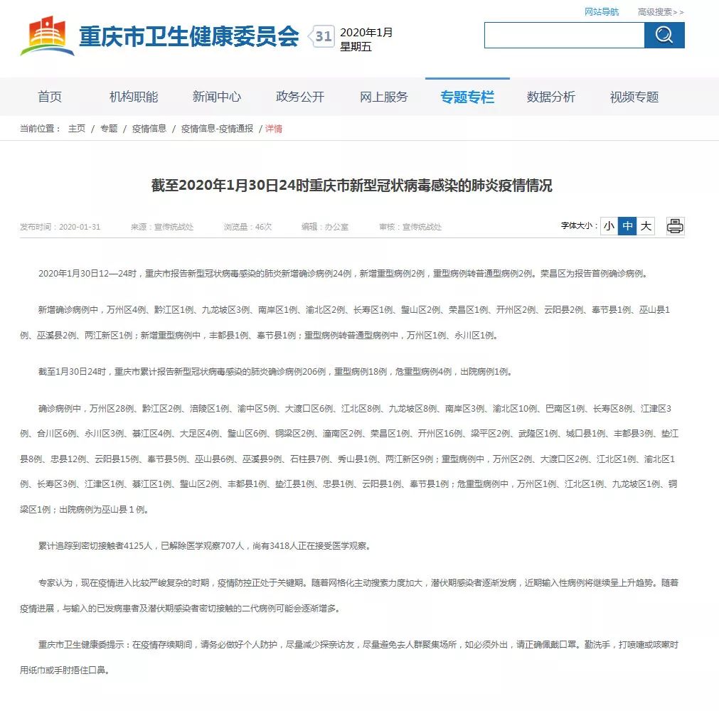 1月31日电 据国家卫生健康委员会官方网站消息 ,1月30日0-24时,31个省(自治区 、直辖市)和新疆生产建设兵团报告新增确诊病例1982例,新增重症病例157例 ,新增死亡病例43例(湖北省42例、黑龙江省1例),新增治愈出院病例47例,新增疑似病例4812例。