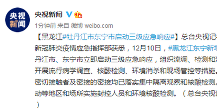 12月10号黑龙江省东宁市牡丹江启动三级应急响应 ,事件源于黑龙江省东宁市新增一例本土确诊新冠肺炎病例,黑龙江省东宁市立马组织专业队伍进行全面的调查,核酸检测 ,消杀。