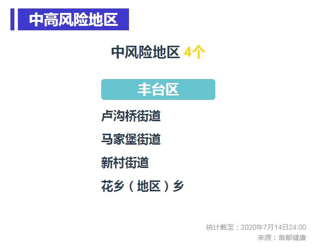 剩余中风险地区:截至7月15日24时,北京市仍有3个中风险地区,分别为丰台区花乡(地区)乡 、马家堡街道、新村街道。