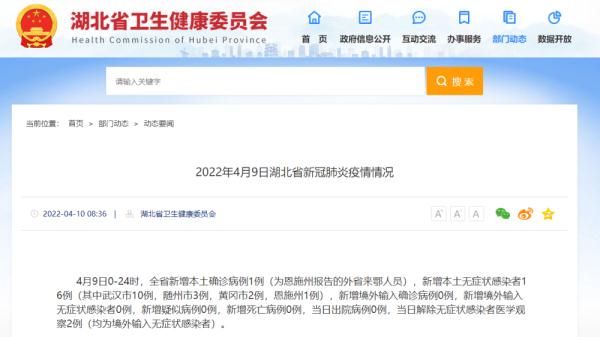 - 新增本土无症状感染者1例(为武汉市无症状感染者)。