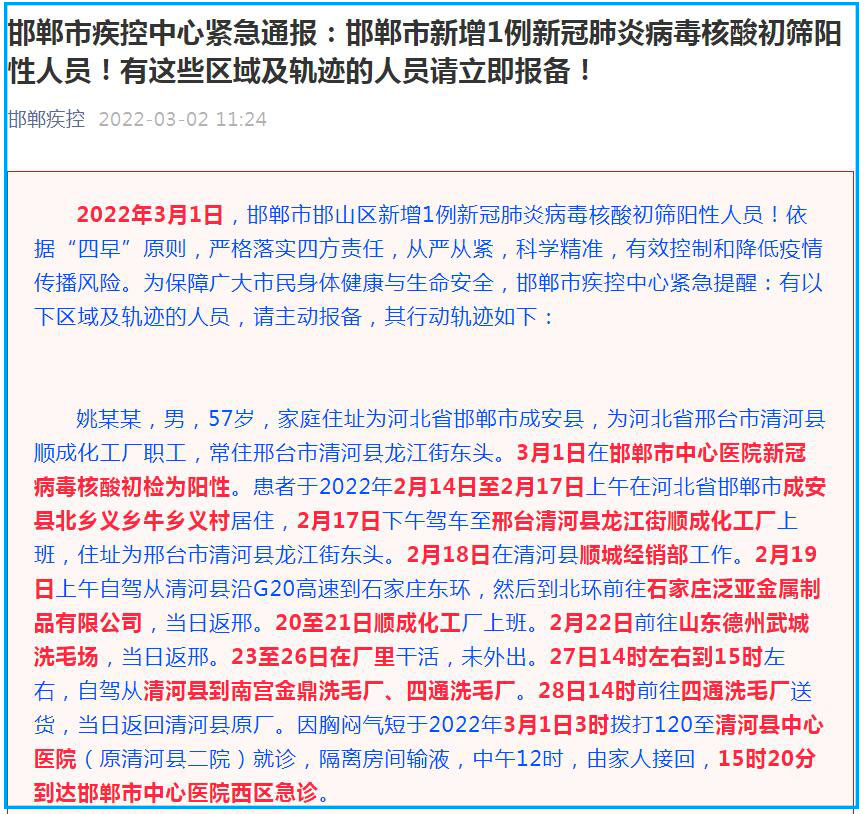 顺义:8月18日下午17时许,顺义区在隔离管控人员中发现一名核酸检测阳性人员,为外省返京人员 。8月16日13:50从青海省西宁市乘坐Z22次列车于17日5:40抵达石家庄 ,8月17日7:30乘坐G6701次列车抵达邯郸,15:15乘坐G1528次列车抵达北京西站。