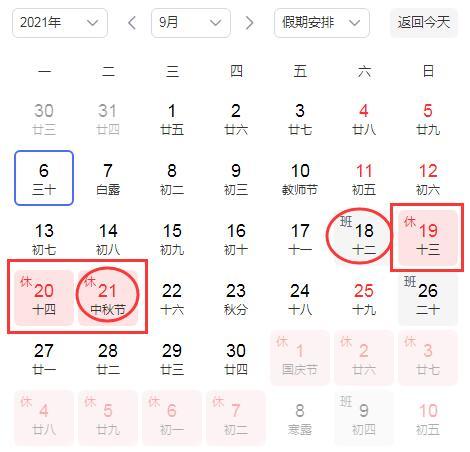6. 中秋节:2021年9月19日(星期日)至9月21日(星期二)放假,共计3天。9月18日(星期六)上班 。