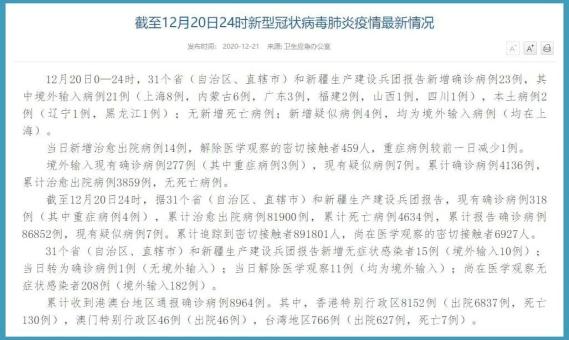 1月6日,国家卫健委网站通报,1月5日0—24时 ,31个省(自治区 、直辖市)和新疆生产建设兵团报告新增确诊病例32例,其中境外输入病例9例(广东3例,陕西3例 ,上海2例,天津1例),本土病例23例(河北20例,北京1例 ,辽宁1例,黑龙江1例);无新增死亡病例;新增疑似病例2例,其中境外输入病例1例(在上海) ,本土病例1例(在辽宁)。