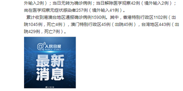 - 港澳台地区通报:累计确诊病例4304698例(香港339998例 ,澳门512例,台湾3964188例) 。