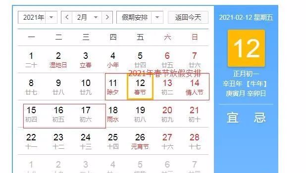 - 春节:2月11日至17日放假 ,共7天。2月7日(周日)、2月20日(周六)为调休上班日。
