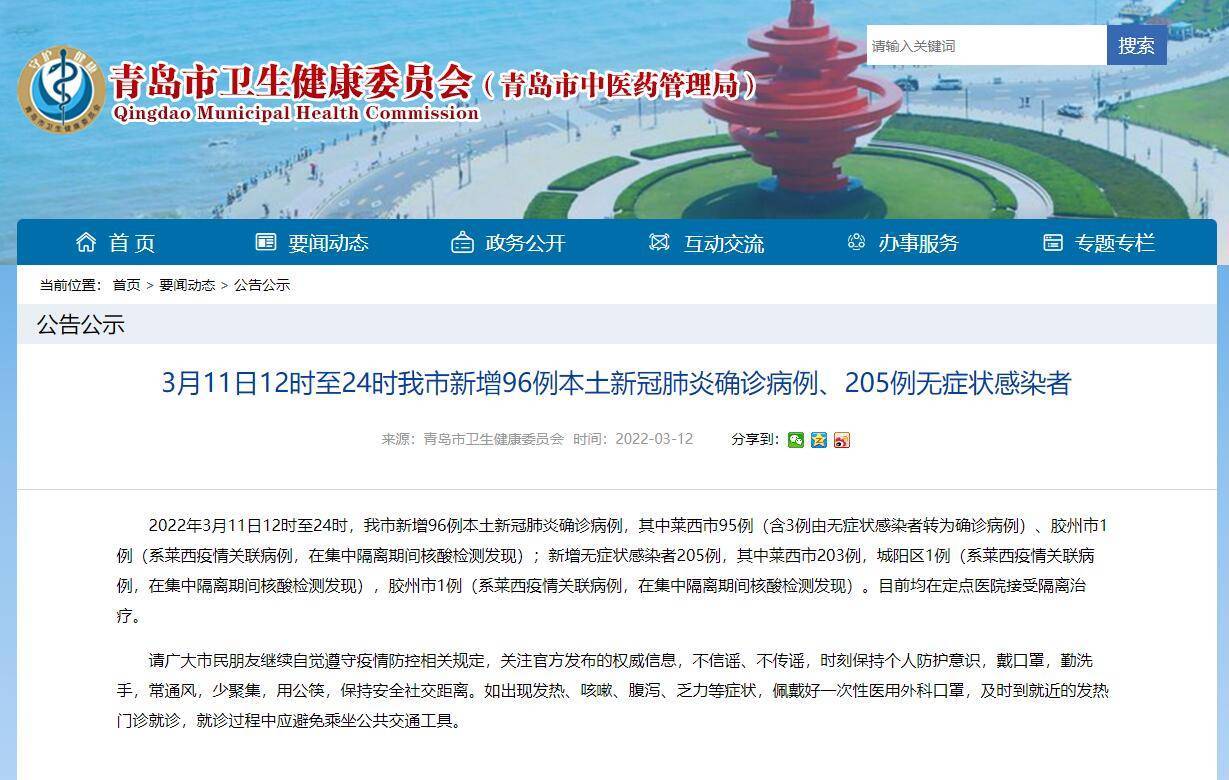 2022年3月7日0时至12时,青岛市新增12例本土新冠肺炎确诊病例及45例无症状感染者 ,其中莱西市为疫情重点区域 。