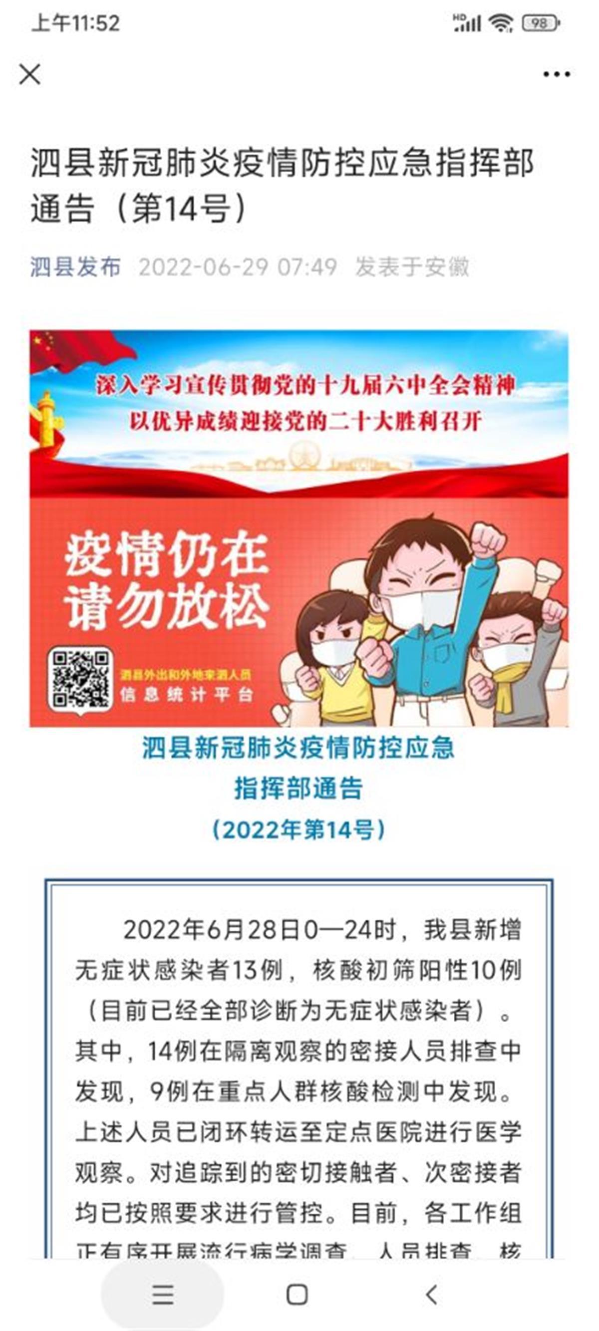 安徽黄山徽州区政府网站消息,徽州区在核酸检测应检尽检中,发现一例初筛阳性感染者。为快速排查传染源 、阻断传播链 ,经研判,决定对全区实施静态管理,居民要严格做到“足不出户” ,停止一切非必要流动和活动 。徽州区新冠肺炎疫情防控应急指挥部关于开展区域新冠病毒核酸检测的通告根据徽州区当前新冠肺炎疫情防控形势,为快速排除风险隐患,决定在全区开展区域核酸检测 ,现将有关事宜通告如下: