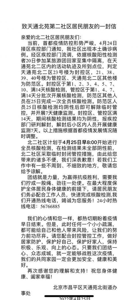 根据题主的问题,我的回答如下。2022年4月25日 ,昌平区疾病预防控制中心对隔离控制人员进行核酸检测,发现1名阳性者,为昌平区确诊病例的妻子 ,家住天通苑北二区 。昌平区立即开展流向追踪、隔离控制、核酸检测和风险点筛查。初始流跟踪轨迹如下: