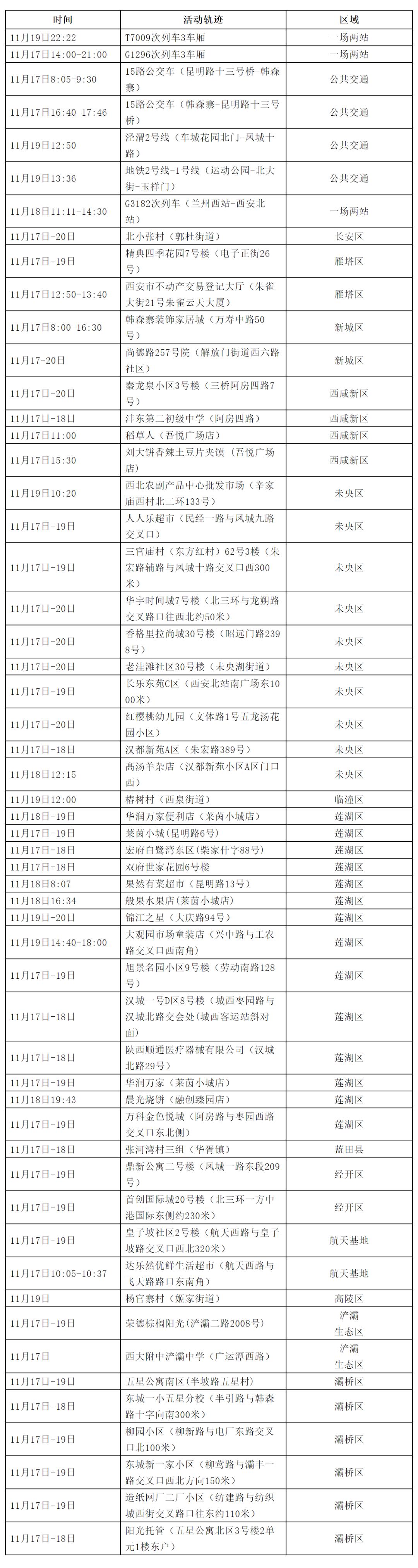 雁塔区:长延堡街道长丰园小区1期2号楼、2期15号楼;伟丰花园小区13号楼;丈八东路2号家属院1 、2号楼;紫郡长安小区北区F5栋、F6栋;小寨路街道雅荷翠华小区3号楼。