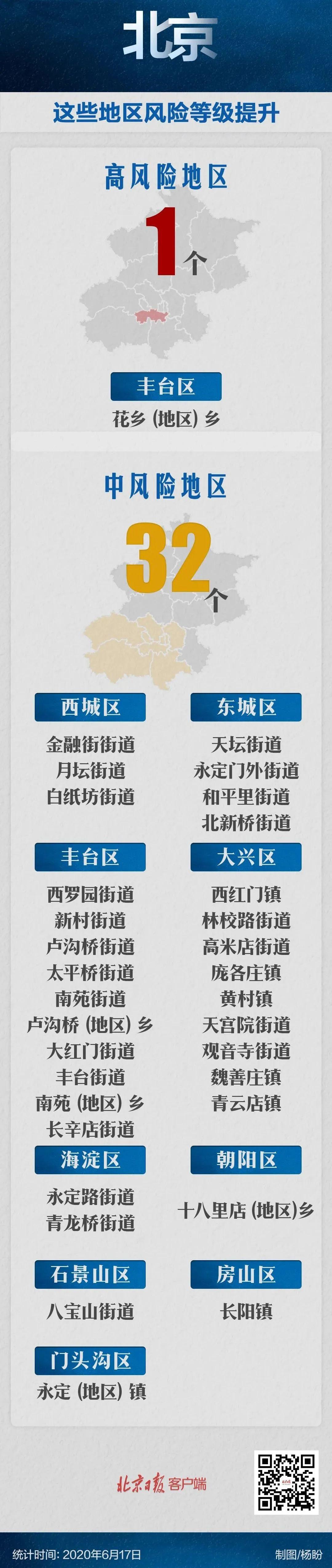 中风险地区:有中风险地区6个,除上述新升级的5个地区外 ,还包括朝阳区潘家园街道松榆东里社区。