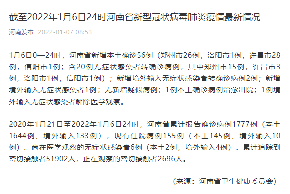 当日新增确诊病例共6例,其中本土确诊5例(郑州市1例;洛阳市 、许昌市各2例 ,均为无症状感染者转确诊),境外输入确诊1例 。