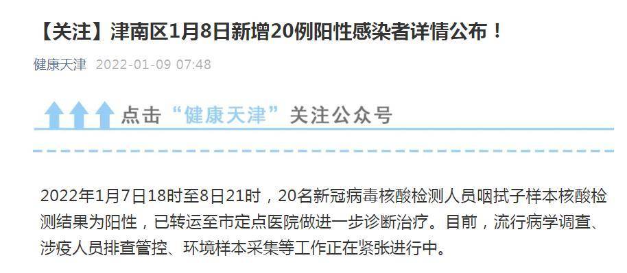 2022年1月8日21时至1月9日21时,天津市津南区新增20例新冠病毒核酸检测阳性感染者 ,具体情况如下:
