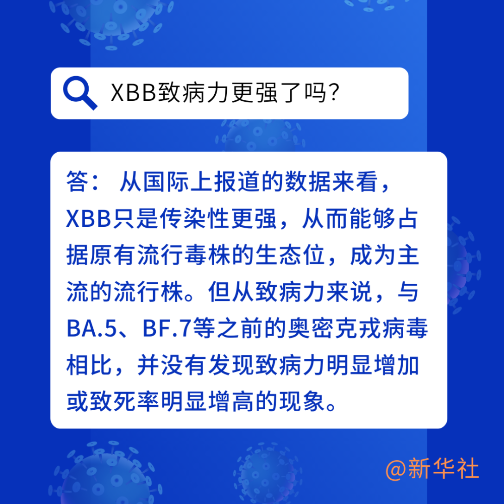 - XBB是否会导致二次感染:XBB致病性和之前的毒株差不多 ,但免疫逃逸能力增加,病毒传播速度可能更快 。再次感染的概率取决于再次遇到的毒株与BA.5和BF.7的重叠程度以及人自身抗体水平。即使第一波感染的不是XBB,也不会“白感染 ” ,因为不论哪种毒株,都能建立起一道免疫屏障,降低后续感染的可能性及危害。