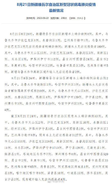乌鲁木齐市:新增治愈出院确诊病例6例,新增解除医学观察无症状感染者645例 。