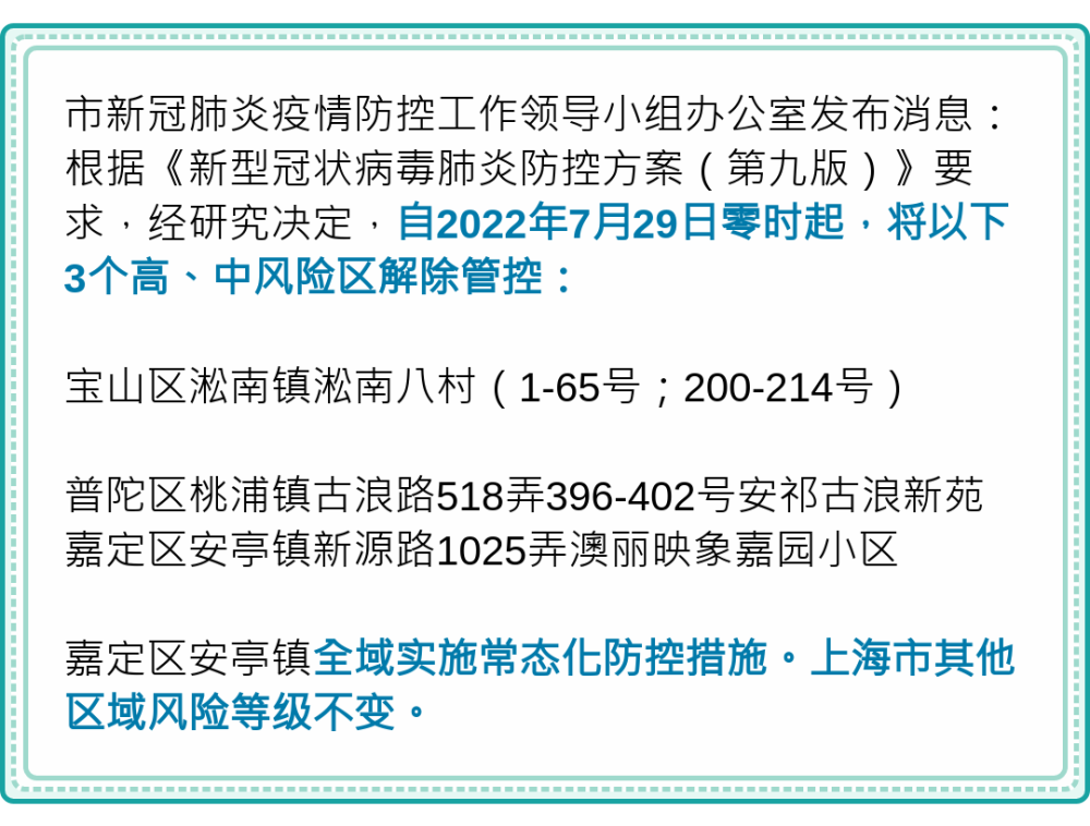 黄浦区南京东路街道、静安区宝山路街道、普陀区桃浦镇 、虹口区嘉兴路街道、虹口区凉城新村街道、宝山区高境镇 、嘉定区安亭镇、松江区叶榭镇、松江区方松街道、松江区中山街道全域实施常态化防控措施 。上海市其他区域风险等级不变。
