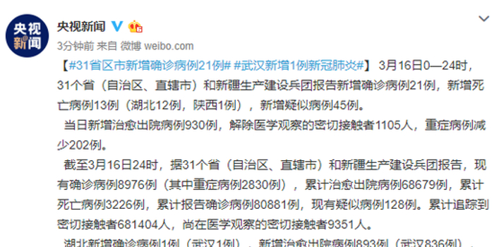 以上内容参考 中青网-31省份新增确诊病例64例 其中本土病例21例