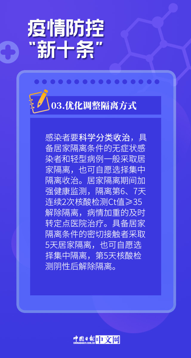 - 感染者和密接者隔离方式调整及考虑:奥密克戎变异株致病性减弱,无症状和轻型病例可居家隔离 ,加强健康监测,病情加重转定点医院。密接者居家隔离5天,加强管理并完成核酸检测。考虑:体现人民至上、生命至上原则 ,根据病毒变异和疫情形势动态优化防控措施 。